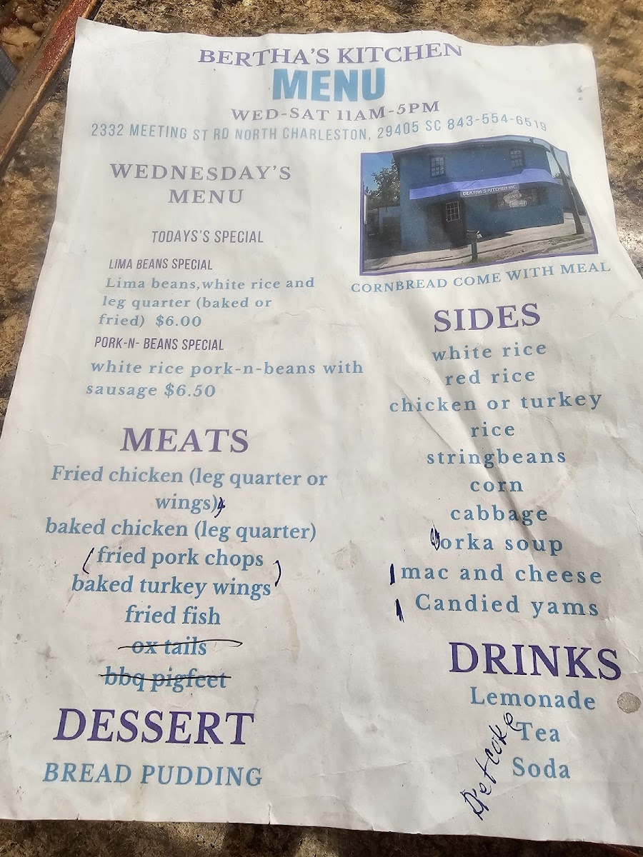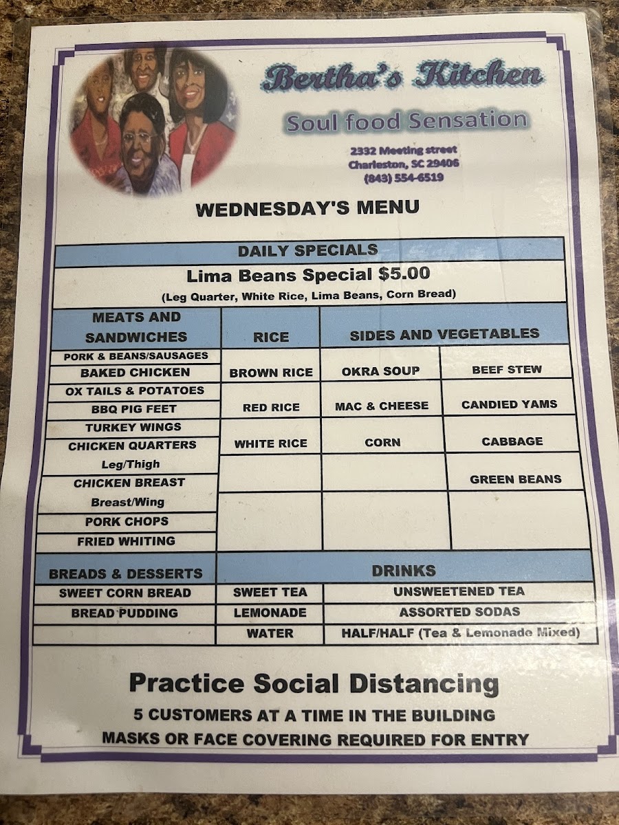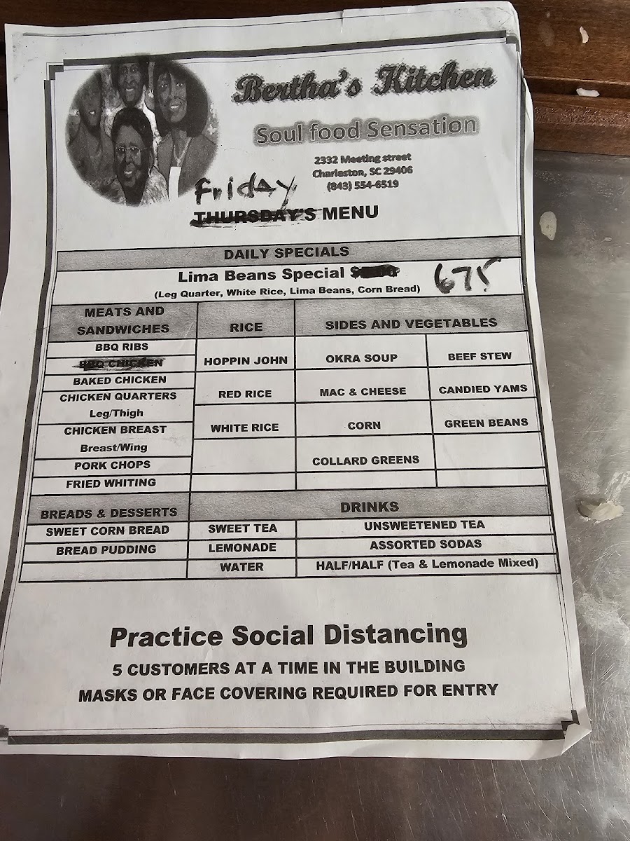 Bertha's Kitchen: A Must-Visit for Soul Food Lovers Atmosphere: The restaurant had a cozy and quaint atmosphere, perfect for a casual meal with friends or family. Food: We opted for the daily special, which included white rice, beans, and our choice of fried or baked chicken. We substituted the beans for collard greens and maccaroni and cheese. Every dish was very flavorful and very well portioned! Also, the daily specials were only 6.75 each before substitutions! Service: The staff was incredibly polite and attentive. They gave us several recommendations for our first time and made sure we had everything we needed. Memorable Experience: The line around the building 15 minutes before they opened was a testament to the popularity of this place. It was definitely worth the wait! Overall Impression: Bertha's Kitchen is a great place to experience authentic soul food in a warm and inviting atmosphere. The daily specials are a great value, and the food is consistently delicious. I highly recommend it!
