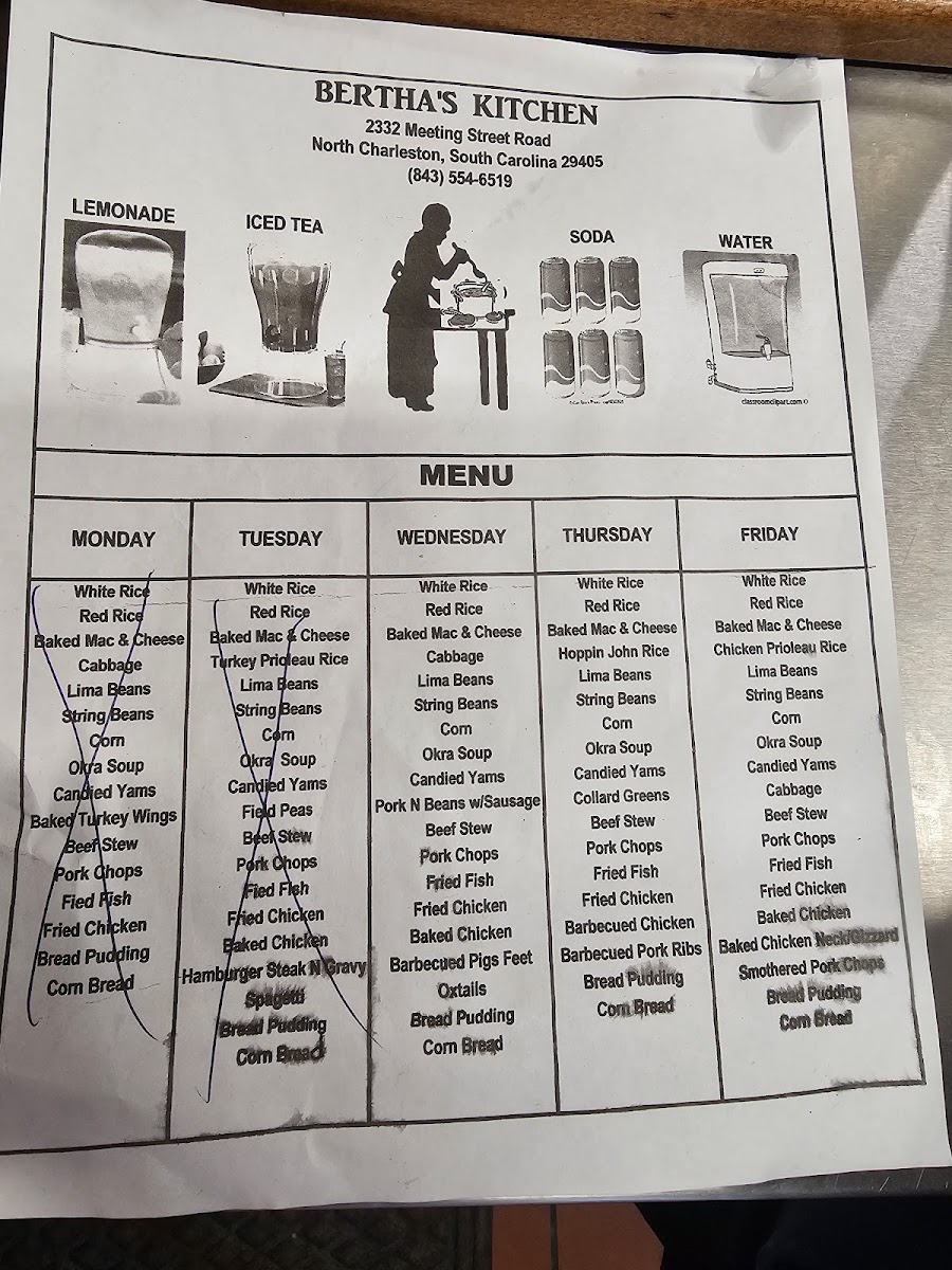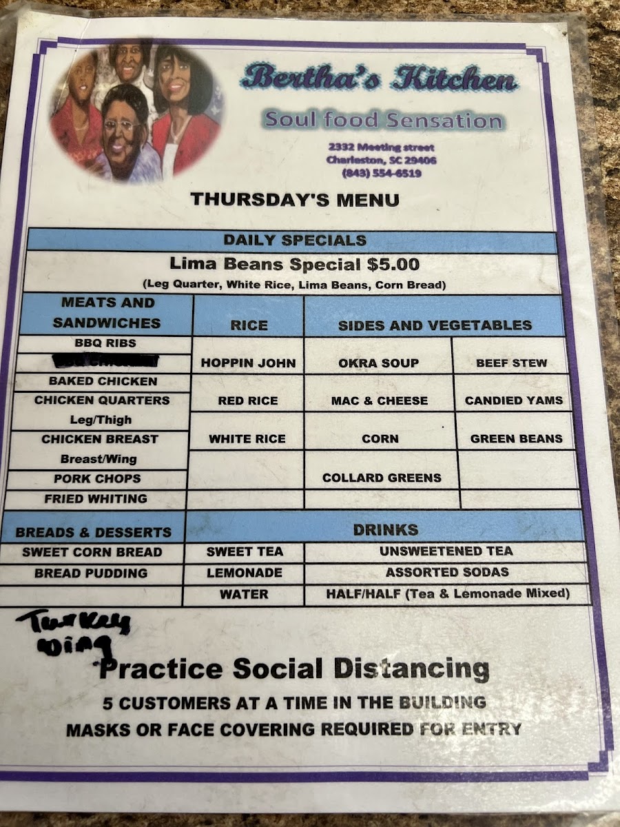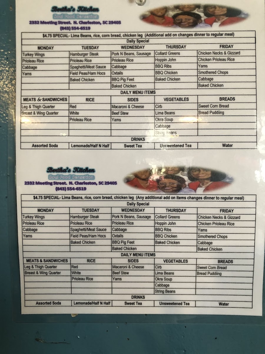 Bertha's Kitchen: A Must-Visit for Soul Food Lovers Atmosphere: The restaurant had a cozy and quaint atmosphere, perfect for a casual meal with friends or family. Food: We opted for the daily special, which included white rice, beans, and our choice of fried or baked chicken. We substituted the beans for collard greens and maccaroni and cheese. Every dish was very flavorful and very well portioned! Also, the daily specials were only 6.75 each before substitutions! Service: The staff was incredibly polite and attentive. They gave us several recommendations for our first time and made sure we had everything we needed. Memorable Experience: The line around the building 15 minutes before they opened was a testament to the popularity of this place. It was definitely worth the wait! Overall Impression: Bertha's Kitchen is a great place to experience authentic soul food in a warm and inviting atmosphere. The daily specials are a great value, and the food is consistently delicious. I highly recommend it!